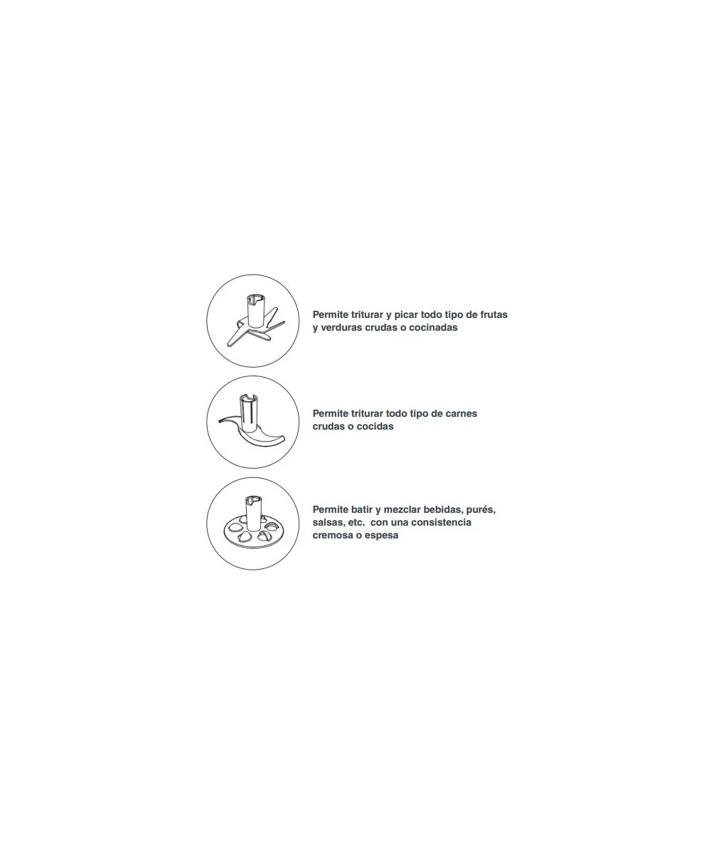 Incluye tres cuchillas intercambiables de acero inoxidable de máxima calidad, un soporte y llave para cambiar las cuchillas: * Cuchilla picadora: cuchilla con recubrimiento de titanio compuesta por dos cuchillas rectas y dos curvas para un rendimiento óptimo y profesional. Permite triturar y picar todo tipo de frutas y verduras crudas o cocinadas. * Cuchilla para carne: permite triturar todo tipo de carnes crudas o cocinadas. * Cuchilla batidor: permite batir y mezclar bebidas, purés, salsas, etc. con una consistencia cremosa o espesa. * Soporte: permite tener la batidora siempre al alcance y almacenar las cuchillas y la llave de cambio.