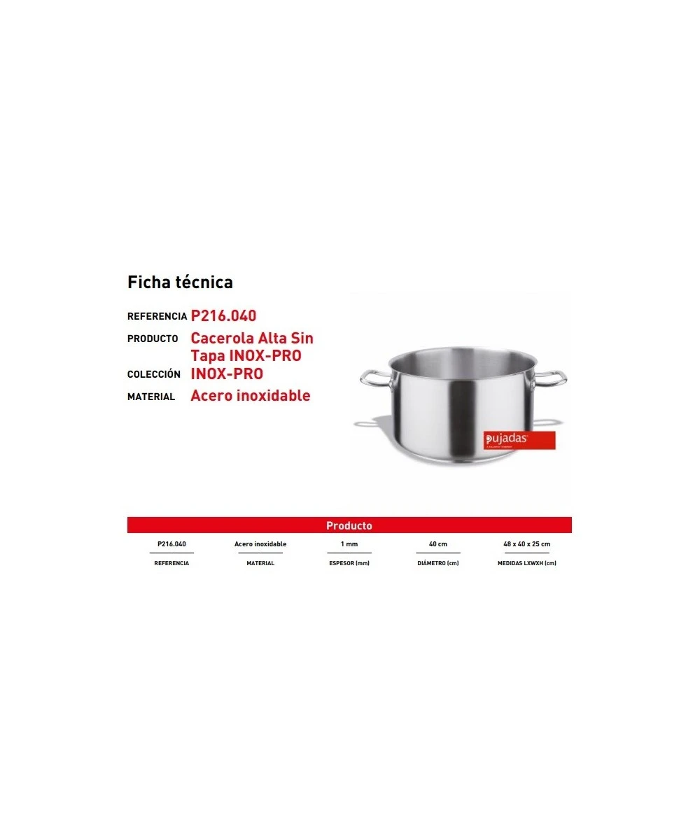 CACEROLA ALTA 40 CM SIN TAPA INOX-PRO PUJADAS P216040