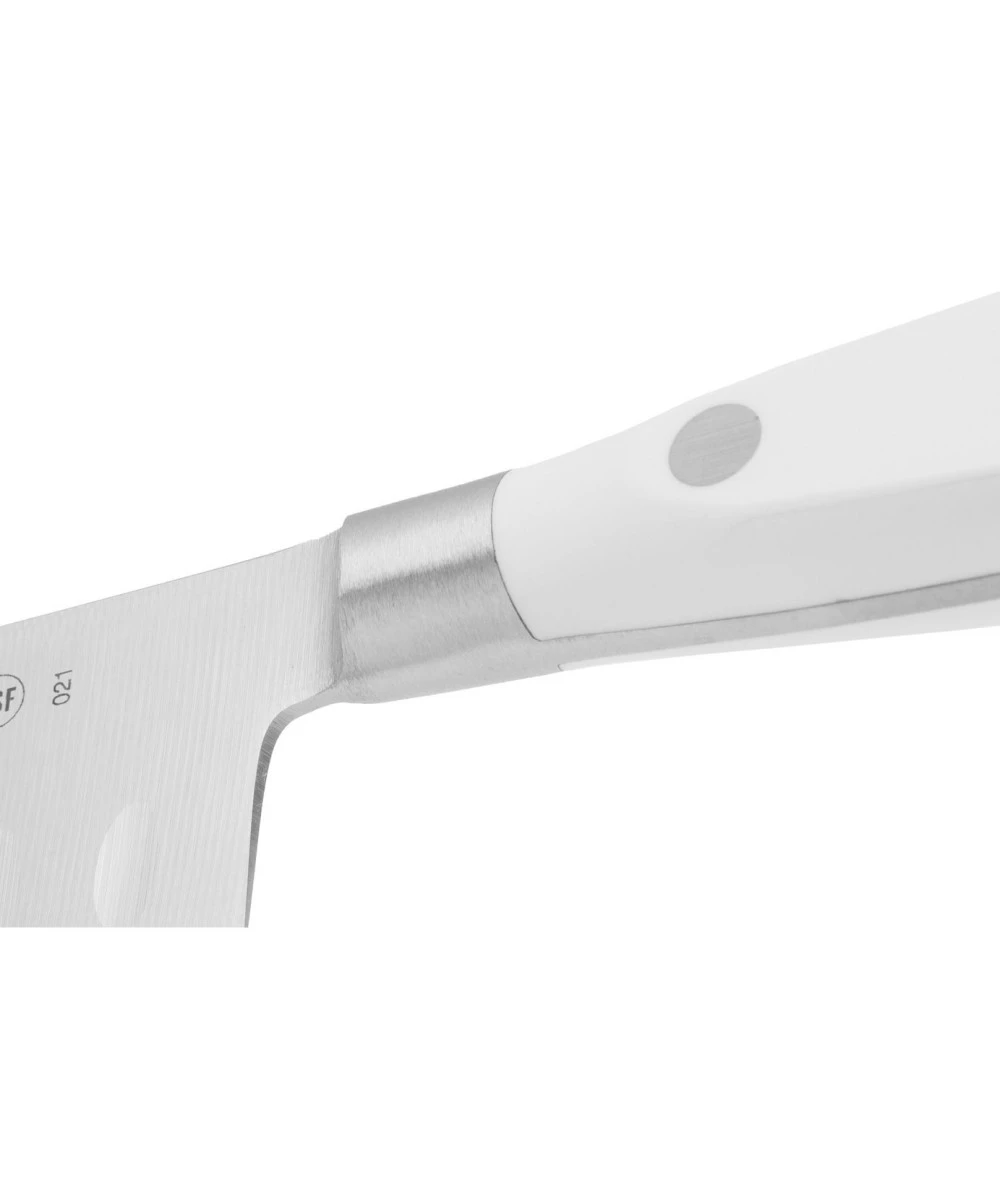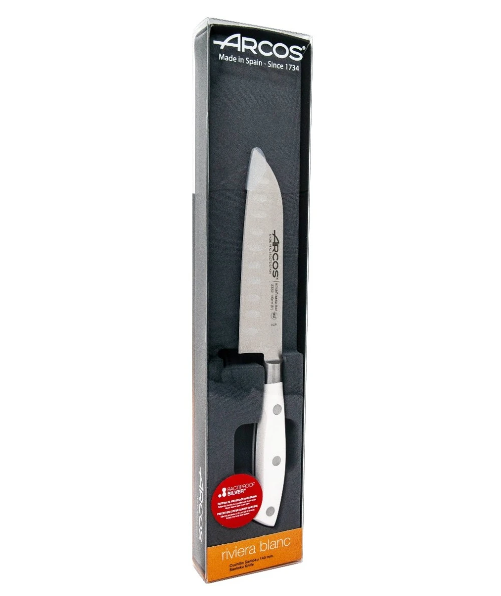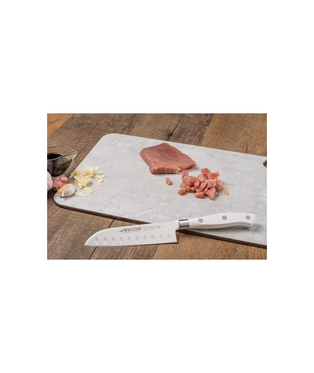 Santoku de 140 mm forjado en una sola pieza con acero inoxidable NITRUM®, exclusivo de Arcos. Destaca por su mango de color blanco y elegante virola de estilo francés.