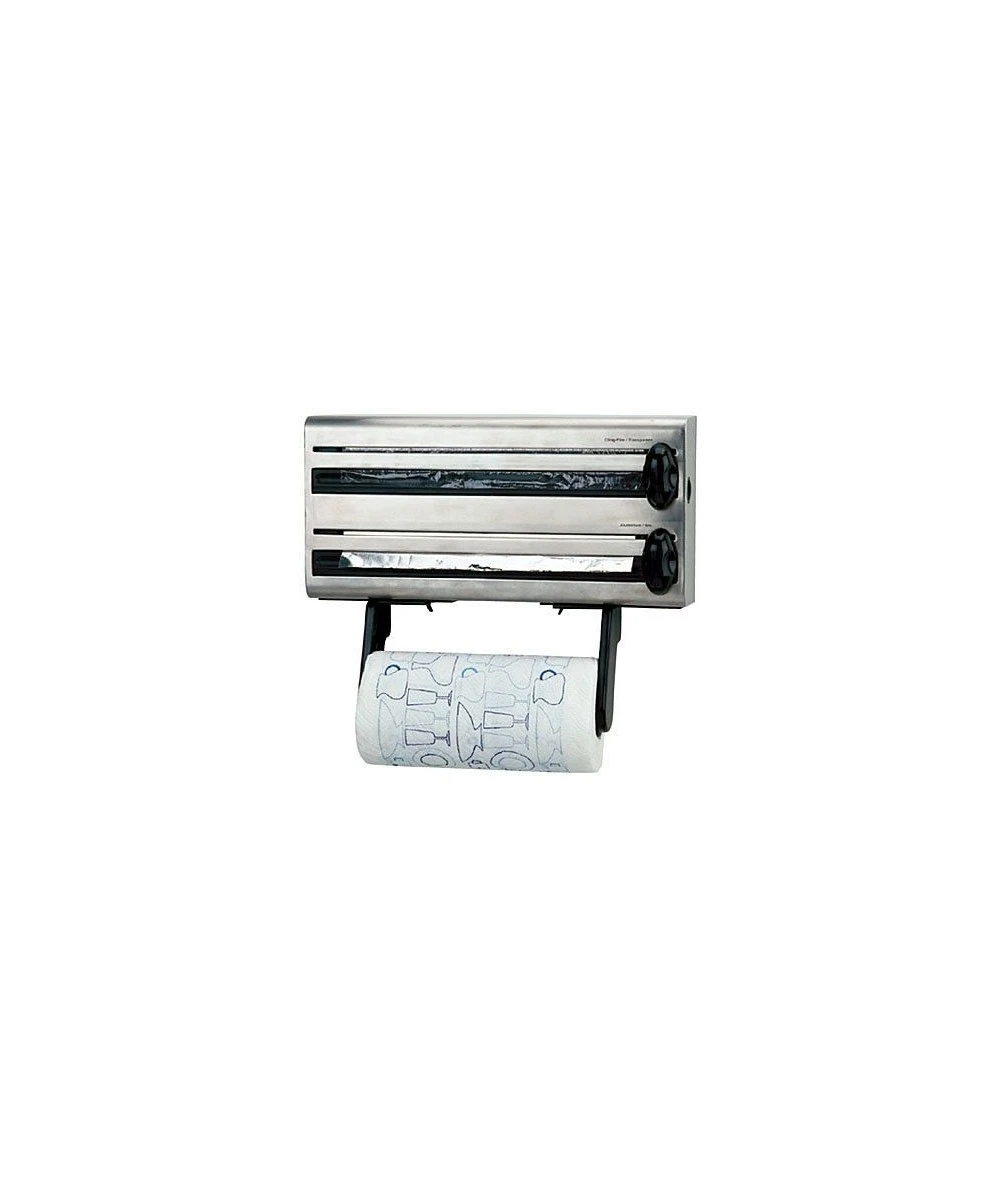 Soporte para rollos de papel, aluminio, plástico transparente y papel celulosa.