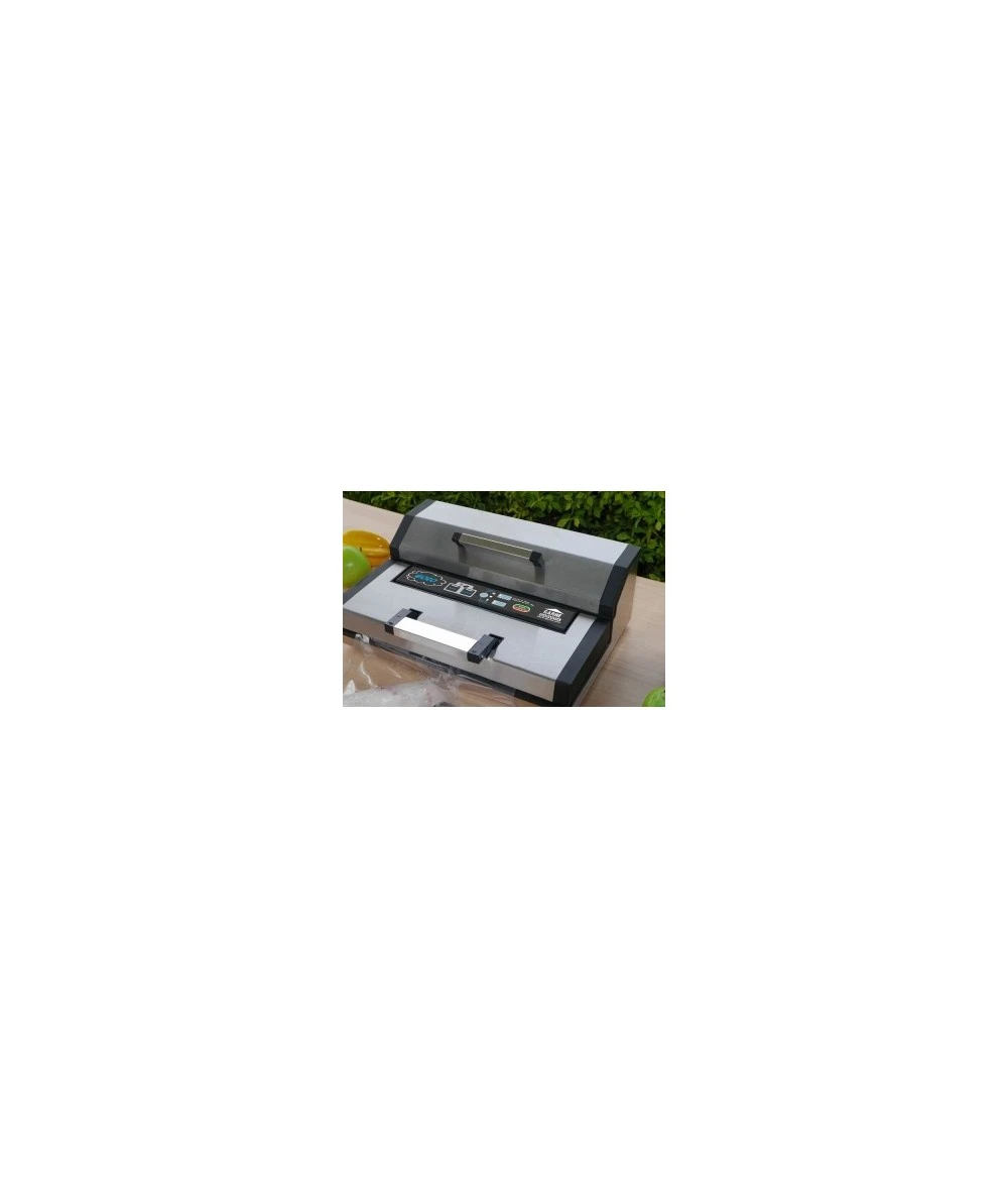 Envasadora semiprofesional automatica con cubierta inox, compartimento para rollos con cuchilla incorporada, bomba de doble cuerpo y barra de sellado de 3mm con posibilidad de realizar incluso sellado doble.