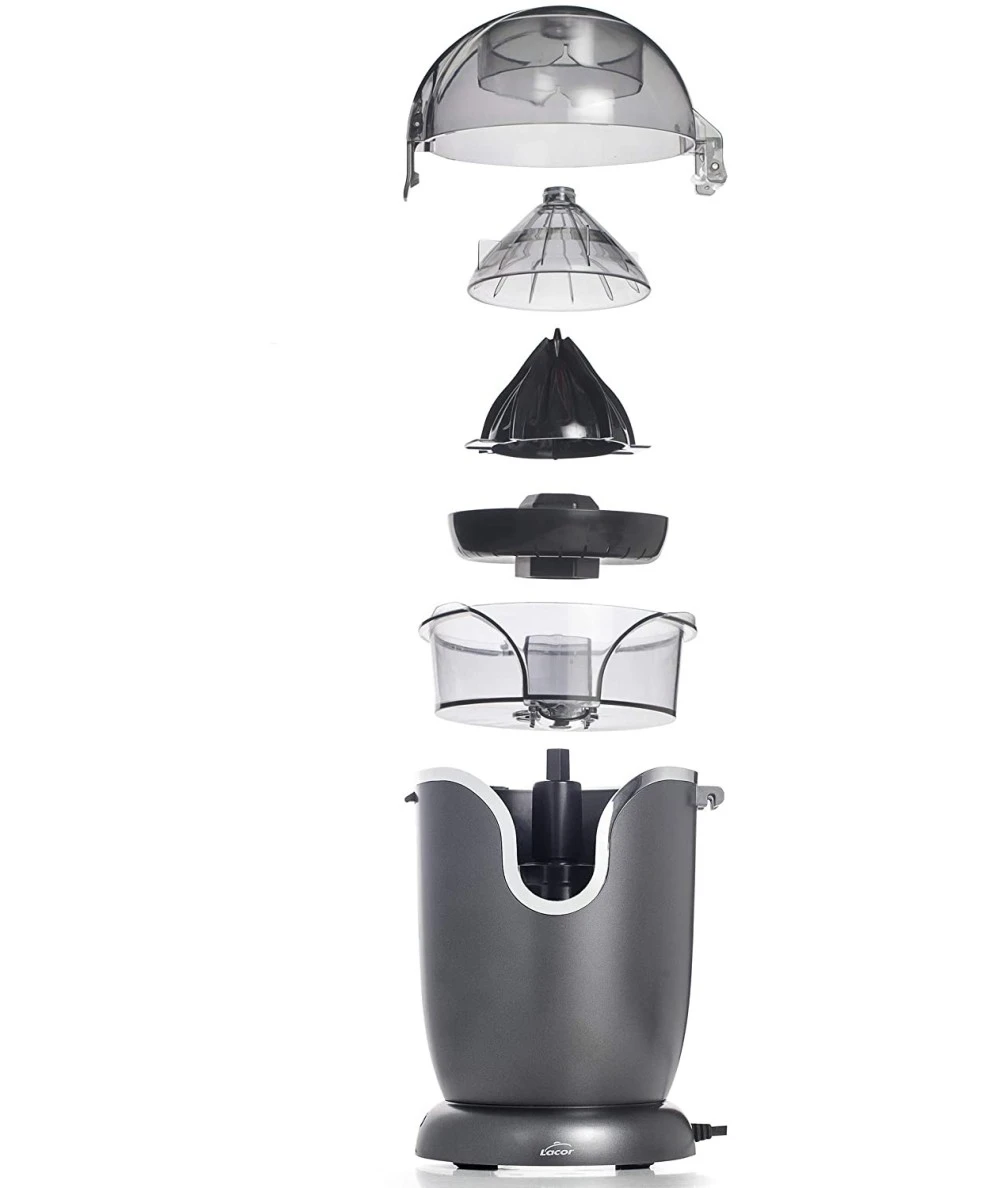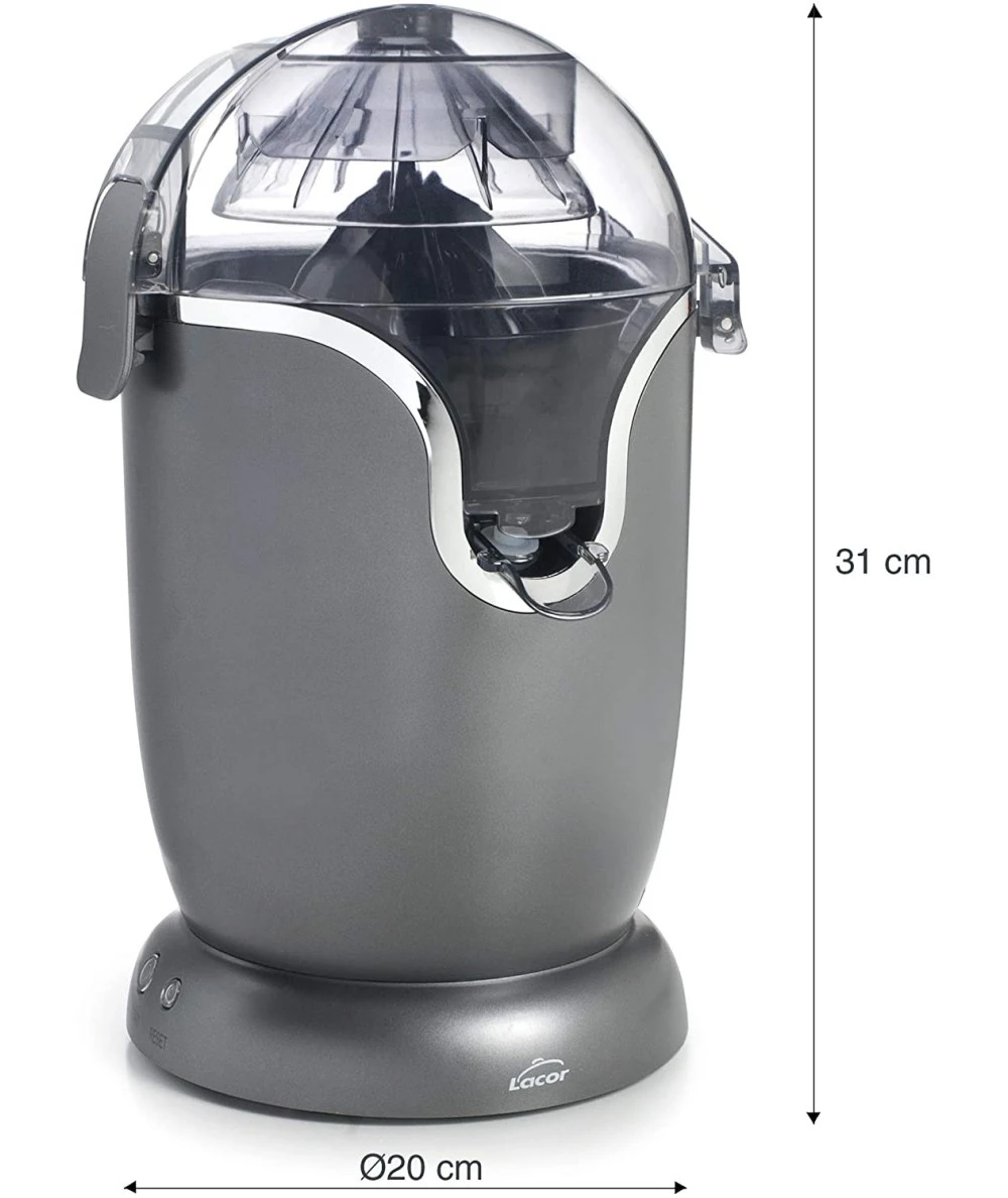 Este exprimidor automático de Lacor (libre de BPA) cuenta con una tecnología innovadora: al pulsar el botón el cono gira y se eleva de manera automática haciendo que la fruta se exprima sola. La tapa se mantiene cerrada durante el funcionamiento y de esta manera se evitan todo tipo de salpicaduras. Además, dispone de un sistema de bloqueo de salida de zumo y protección anti-goteo. Su mecanismo es muy eficaz y exprime hasta la última gota del jugo de frutas. El aparato es totalmente antideslizante gracias a sus patas de goma en la parte inferior.