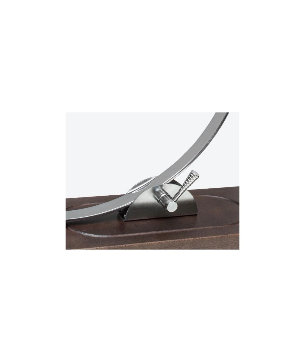 Jamonero fabricado en ESPAÑA con madera de haya blanca europea de primera calidad, los herrajes de acero con el acabado de la superficie en cromo brillo y los pinchos de acero inoxidable AISI-304. El diseño del jamonero nos permite posicionar el jamón a nuestro gusto, debido a la practicidad de su sistema de balanceo, consiguiendo un corte fácil y cómodo para aprovechar al máximo el jamón.