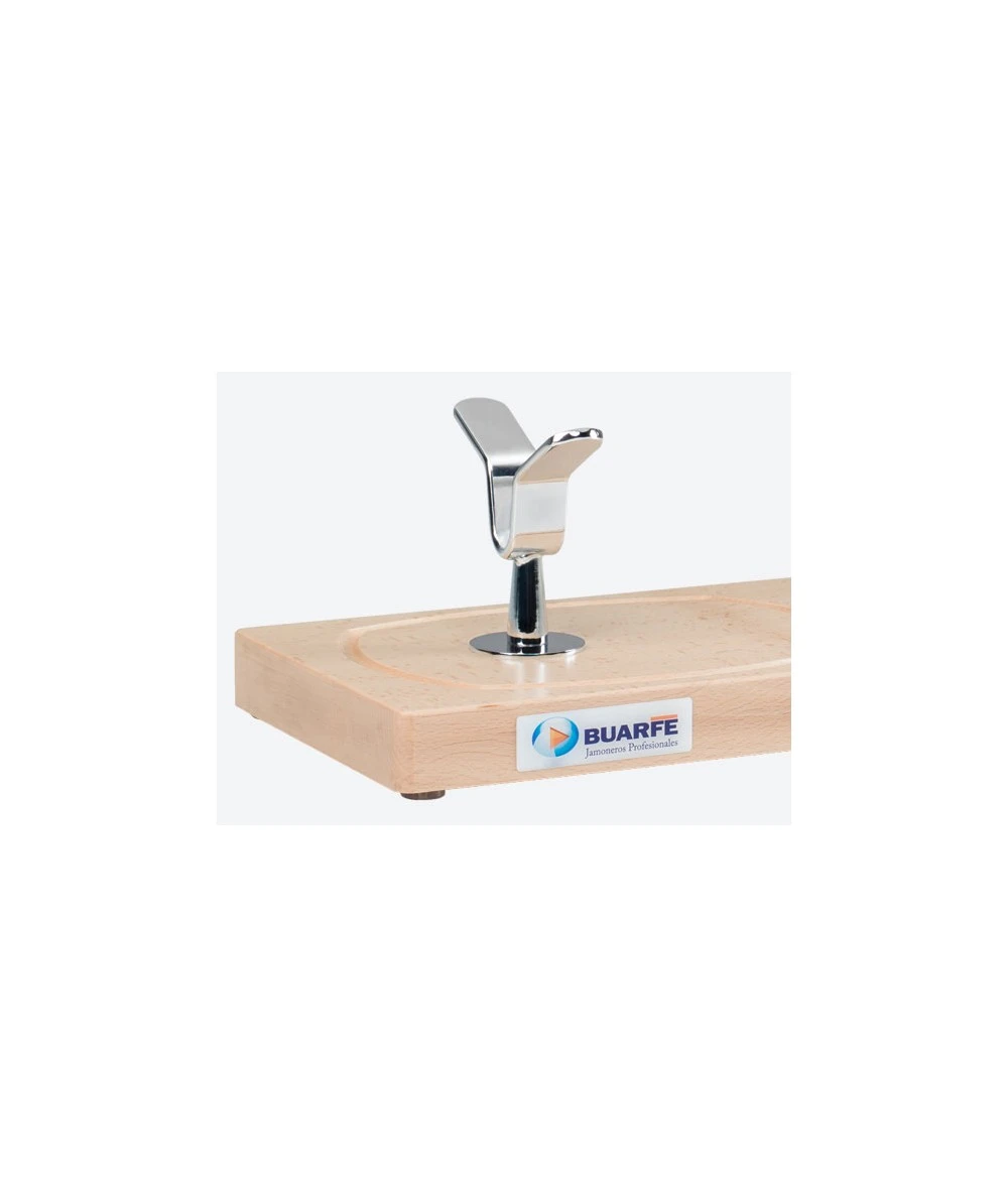 - Jamonero fabricado en ESPAÑA con madera de haya blanca europea de primera calidad, los herrajes de acero con el acabado de la superficie en cromo brillo y pinchos de acero inoxidable AISI-304. Con el sistema de casquillos giratorios se puede girar el jamón los grados que desee sin necesidad de soltar la pata del jamón, su diseño nos permite un corte horizontal fácil y cómodo. El acabado en tabla larga (530 mm.) es ideal para jamones de gran longitud.