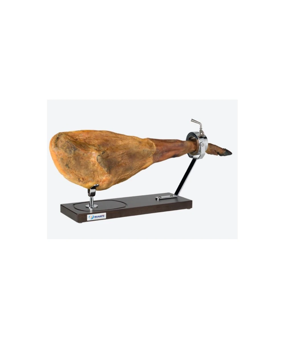 - Jamonero fabricado en ESPAÑA con madera de haya blanca europea de primera calidad, con herrajes de acero acabados en cromo brillo y pinchos de acero inoxidable AISI-304. Con el sistema de casquillos giratorios se puede girar el jamón los grados que desee sin necesidad de soltar la pata del jamón, su diseño nos permite un corte horizontal fácil y cómodo. El acabado en tabla larga (530 mm.) es ideal para jamones de gran longitud. Para una perfecta sujeción del jamonero, hemos equipado su base con cuatro patas antideslizantes de silicona.