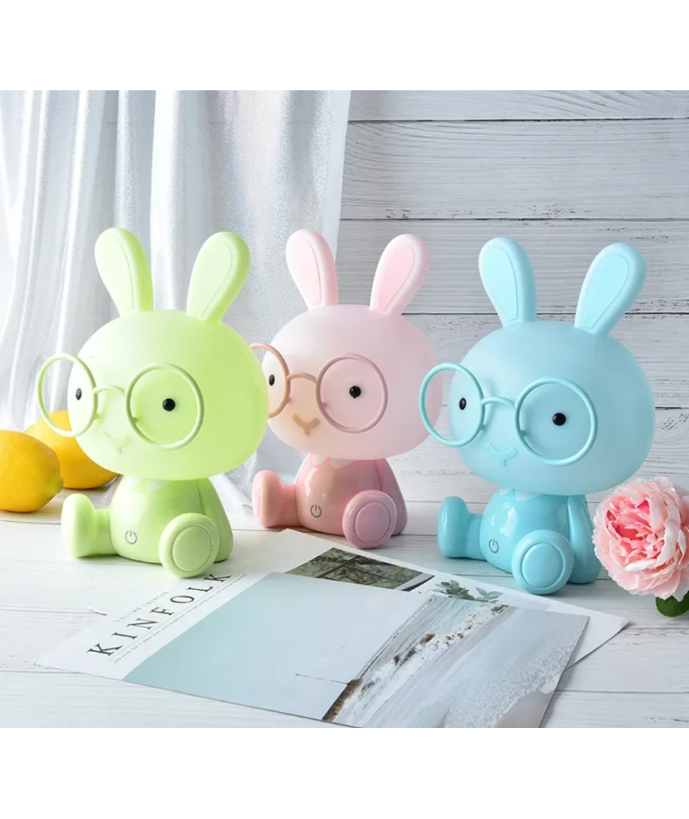 Låmpara de mesa infantil Conejito Rosa para colocar en habitaciones infantiles. Este conejito de color rosa con grandes gafas redondas serå un compañero de noche ideal para los mås peques de la casa. Se recomienda colocar en la mesita de noche al lado de la cama de modo que tu hija pueda fåcilmente encenderla pulsando el botón que incluye en la barriga.