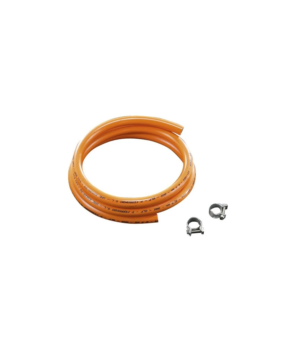 Este blister contiene un tubo flexible para butano de 1,50 metros y 2 abrazaderas. Recomendamos comprobar con frecuencia el estado de conservación y la fecha de caducidad del tubo y sustituirlo en caso de que sea necesario.