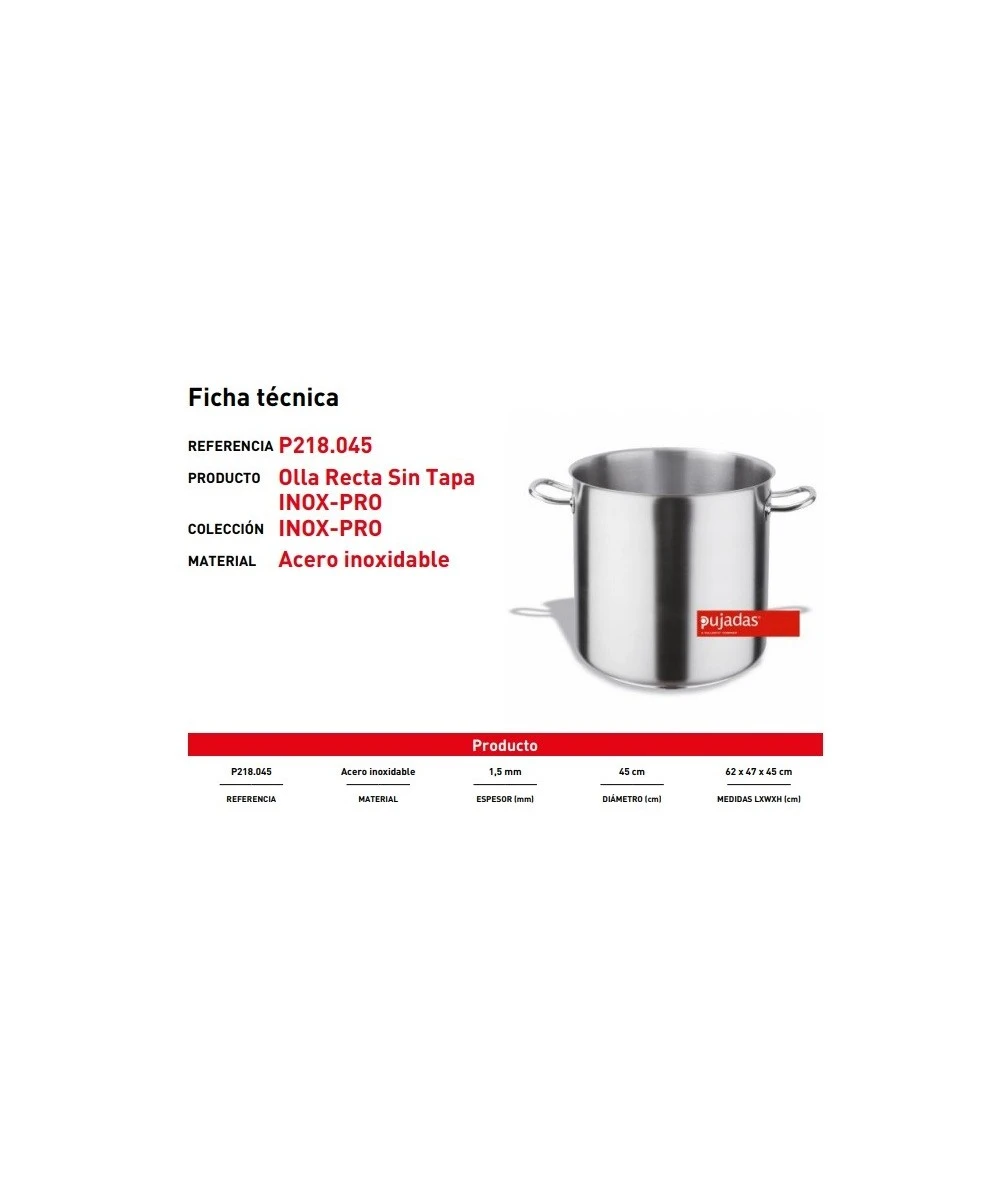 OLLA RECTA 45 CM CON TAPA INOX-PRO PUJADAS P208045