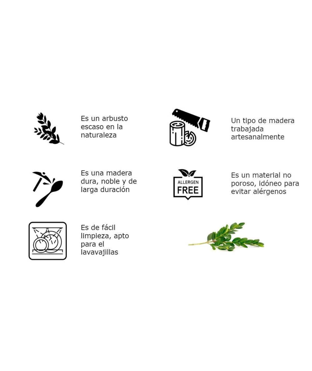 La madera de boj es una madera de calidad conocida especialmente por sus cualidades para la fabricación de toda clase de utensilios. Su nombre científico es «buxus sempervirens«.