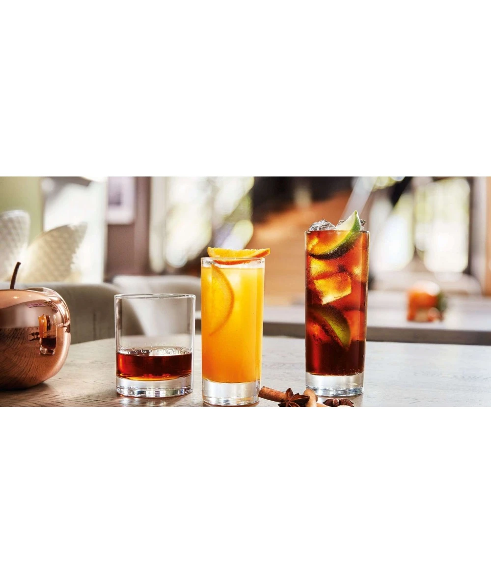 La colección de vasos Islande es sin duda la versión perfecta del vaso multiusos. En función de su capacidad, los 16 vasos caben en las discotecas, aparecen en las mesas de los bistrós, son bienvenidos en los bufés, son perfectos para tomar un whisky al final de una comida. El diseño elegante se ve reforzado por una base gruesa para un aspecto elegante y sofisticado. Esta línea es un «must have» para cualquier establecimiento, desde las barras de los restaurantes hasta los sofisticados bares de los mixólogos. Todos los clásicos se servirán con estilo, ya sean refrescos o zumos de frutas en vasos de trago largo, cócteles imprescindibles como el whisky y la coca-cola o el vodka de naranja en tamaños de tubo, licores y digestivos en tamaños old fashioned o shot.